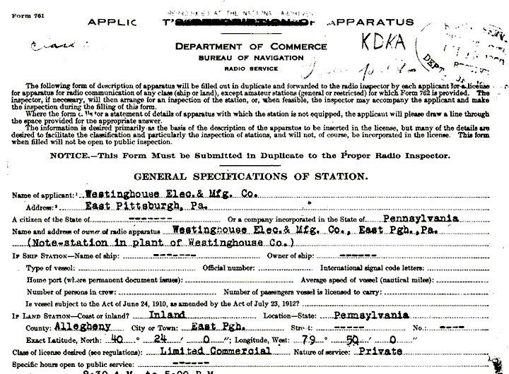 (Note: The first commercial radio station license was issued to Westinghouse for KDKA in Pittsburgh, PA in October 1920. In October 2020, radio will mark its 100th Anniversary. That original license for KDKA is pictured above.)