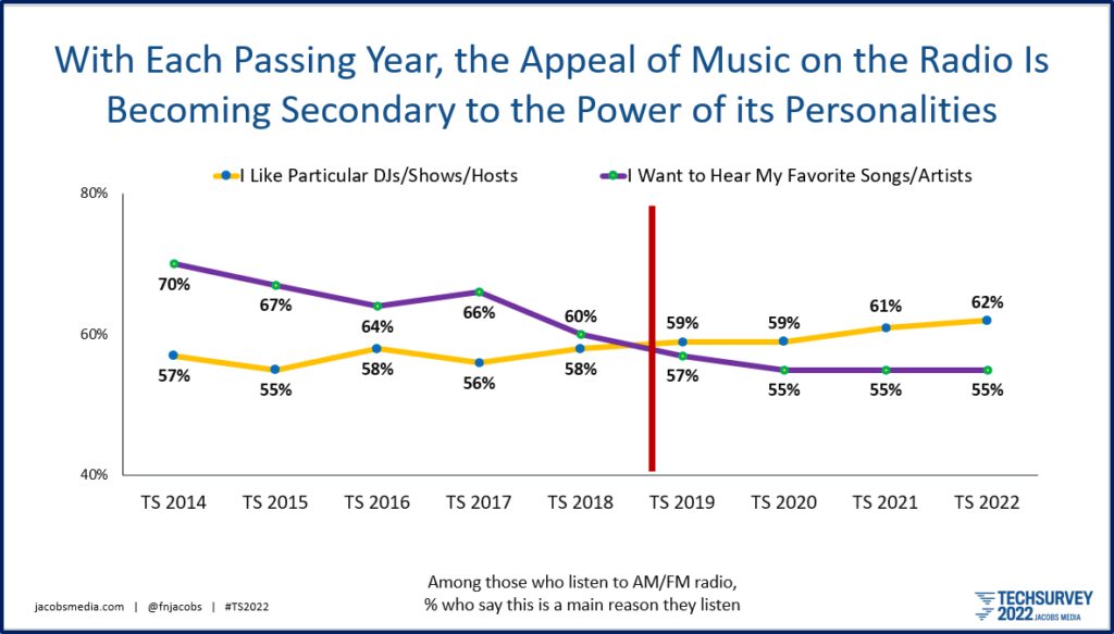 Fred Jacobs has been tracking the power of personalities in his annual Techsuveys, the most recent one which came out in the first quarter of this year. Here’s the trendline:
