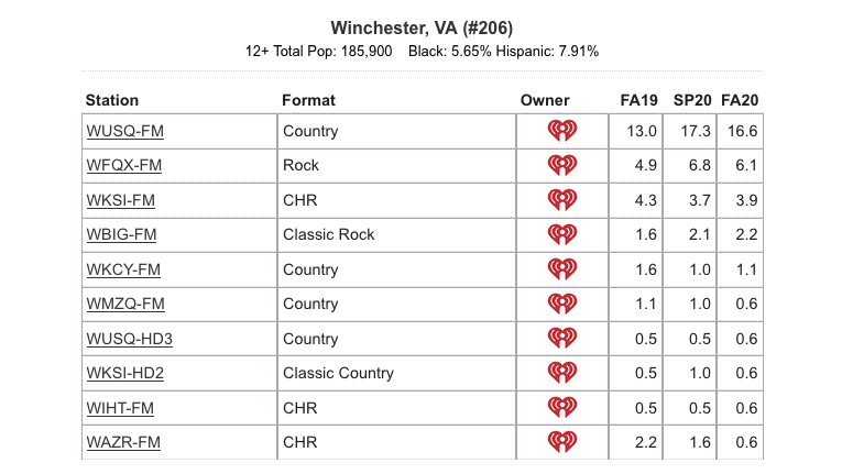 Was it possible that the only radio stations impacting the Winchester, Virginia radio market were owned my iHeartMedia or was something missing?